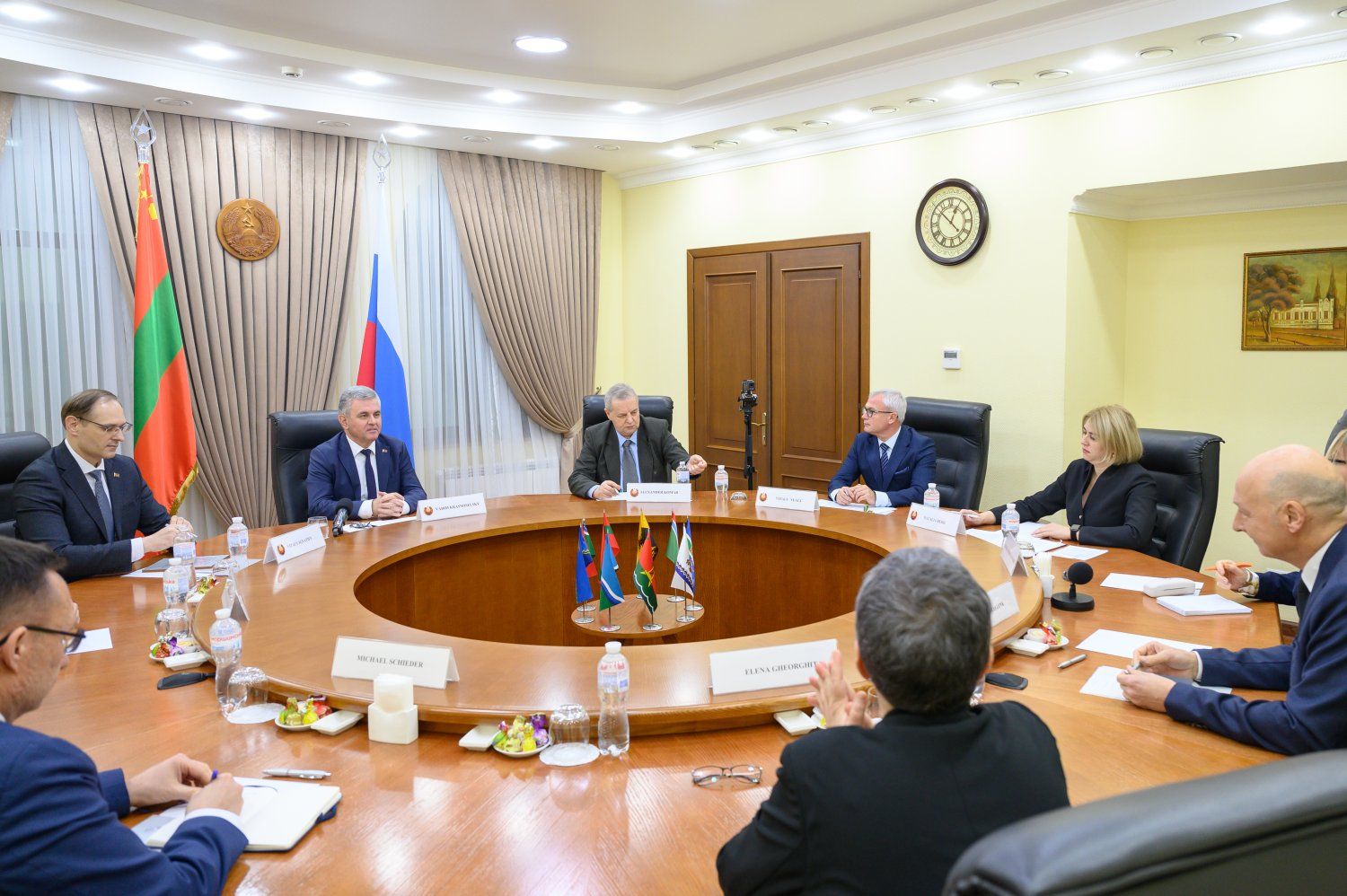 В переговорном зале Администрации Президента ПМР прошла встреча Главы приднестровского государства Вадима Красносельского со Специальным представителем Действующего председателя ОБСЕ Томасом Ленком. В составе европейской делегации прибыла также и. о. главы Миссии ОБСЕ в РМ Изабела Силвия Хартманн. С принимающей стороны к дискуссии присоединились советник Президента ПМР Павел Прокудин, министр иностранных дел ПМР Виталий Игнатьев, глава МВД ПМР Виталий Нягу и главный санитарный врач республики Наталья Берил.