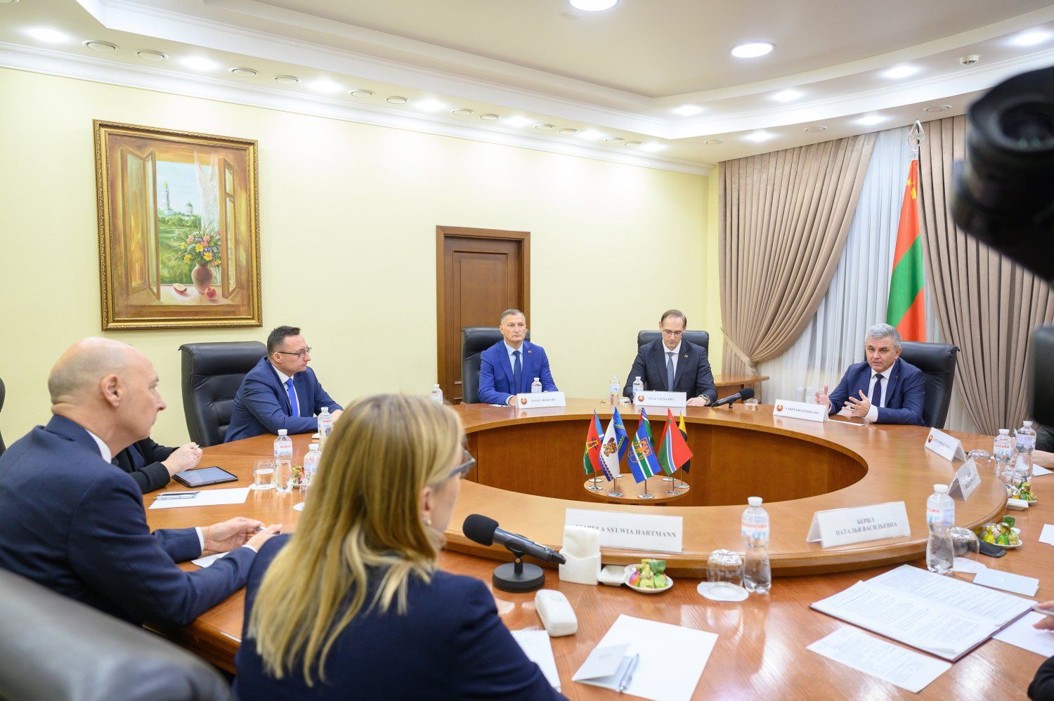 В переговорном зале Администрации Президента ПМР прошла встреча Главы приднестровского государства Вадима Красносельского со Специальным представителем Действующего председателя ОБСЕ Томасом Ленком. В составе европейской делегации прибыла также и. о. главы Миссии ОБСЕ в РМ Изабела Силвия Хартманн. С принимающей стороны к дискуссии присоединились советник Президента ПМР Павел Прокудин, министр иностранных дел ПМР Виталий Игнатьев, глава МВД ПМР Виталий Нягу и главный санитарный врач республики Наталья Берил.